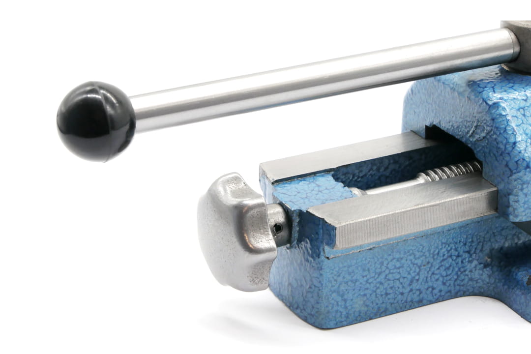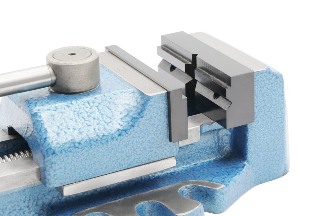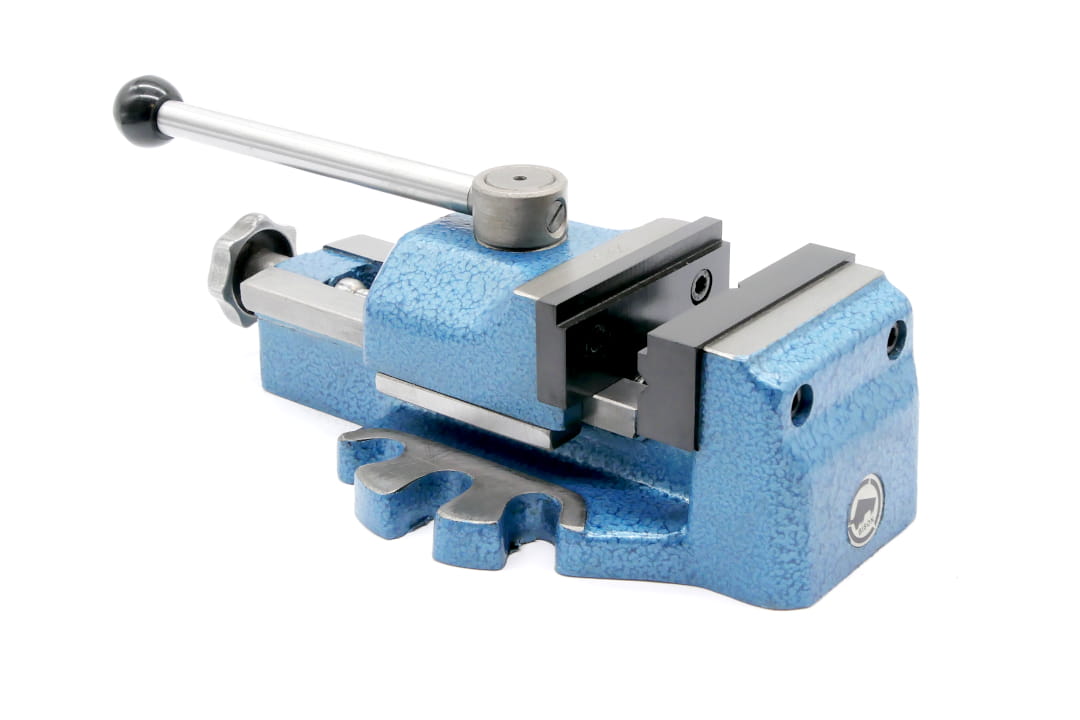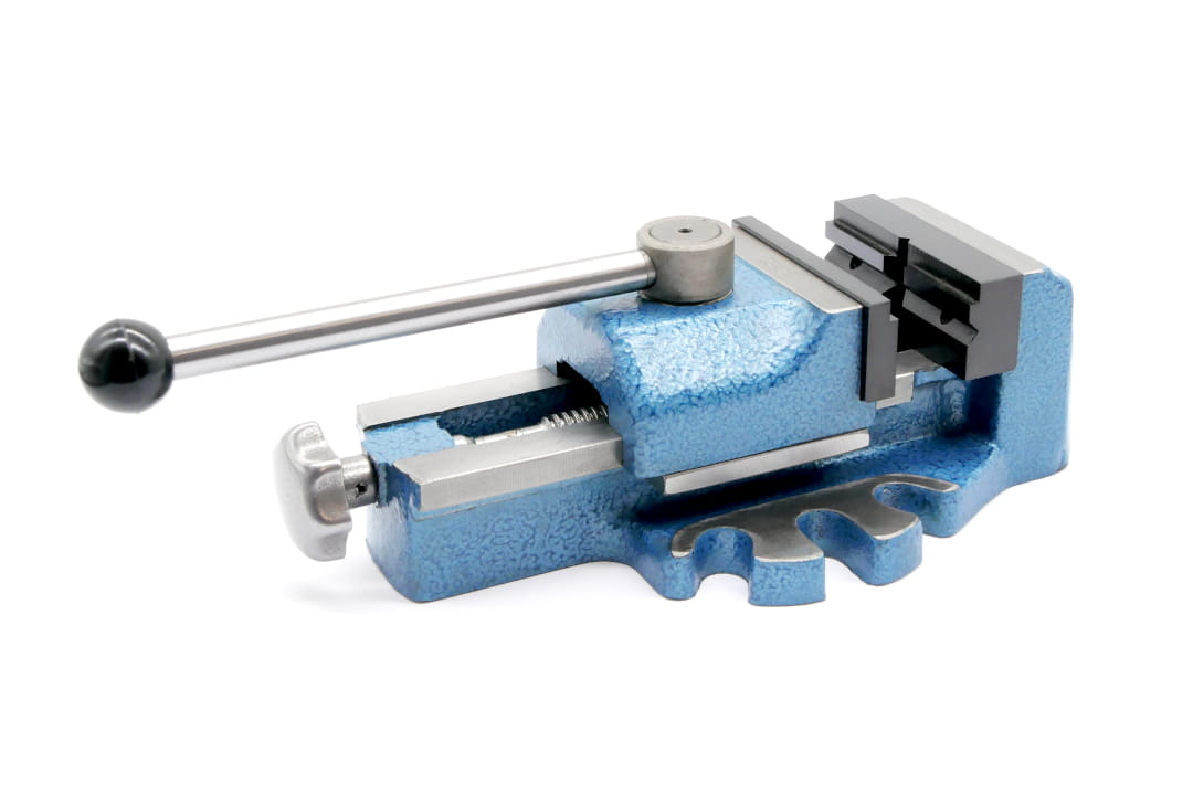 - Imadło do wiertarki stołowej z szybkim mocowaniem przedmiotu za pomocą mechanizmu mimośrodowego.