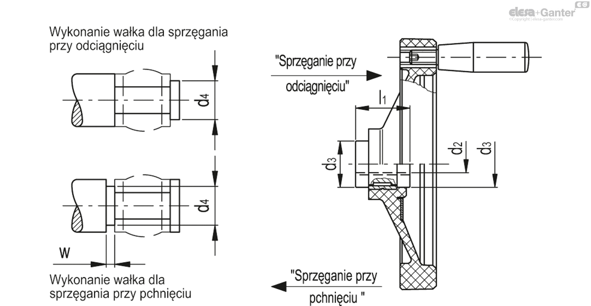 Zgodnie z zasadami bezpieczeństwa koło ręczne, pełne, bezpieczne w pozycji spoczynku jest wysprzęglone. Zasprzęglenie następuje przez jego odciągnięcie. Przy odciągnięciu w kierunku osiowym zazębiają się dwa wielokarby, co powoduje sprzęgnięcie koła z wałem. Po wykonaniu operacji koło powraca automatycznie do pozycji spoczynku (wysprzęglenia).