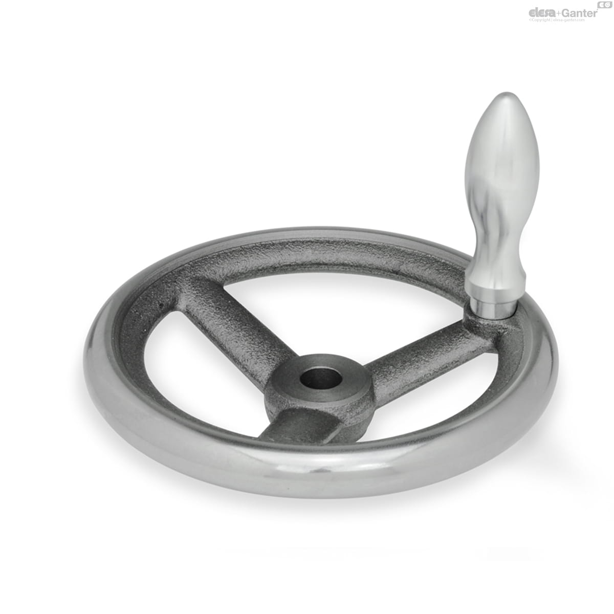 Koła ręczne DIN 950 wykonane z żeliwa są dostarczane z rękojeściami wykonanymi ze stali ocynkowanej. Koła ręczne aluminiowe są dostarczane z rękojeściami wykonanymi z tworzywa (Typ D) i stali ocynkowanej (Typ F).