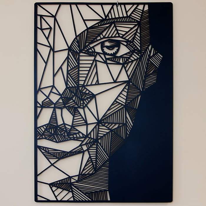 - Metalowa dekoracja ścienna geometryczna "twarz kobiety" to przyciągający oko obraz.