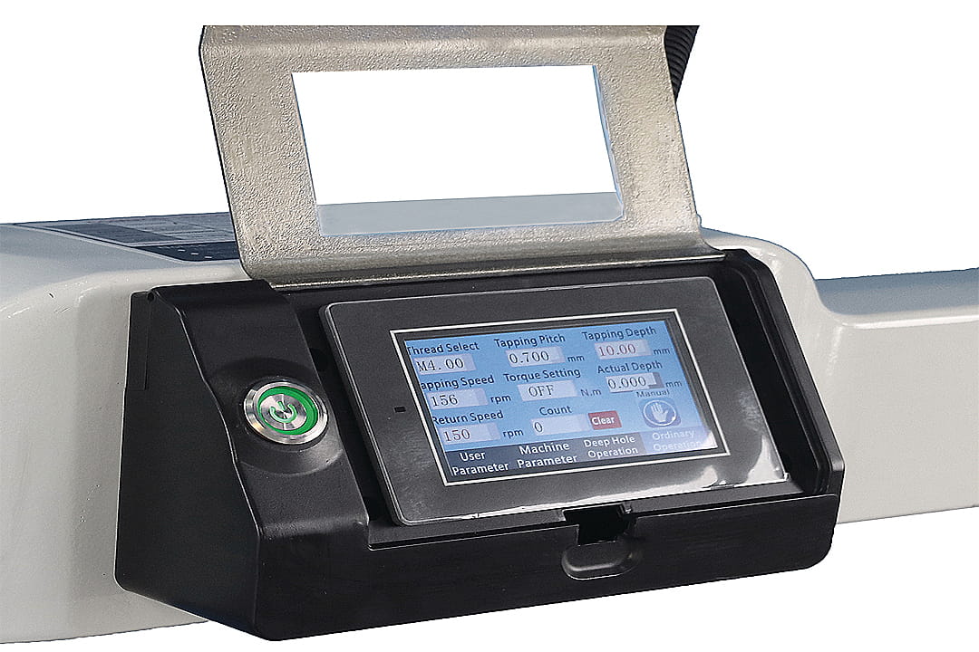 - Obecny na ramieniu obrotowym ekran dotykowy pozwala na ustawienie rozmiaru gwintu, prędkości obrotowej, skoku gwintu oraz głębokości nacinanego gwintu.