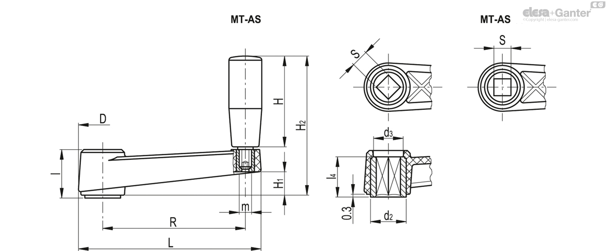 - MT-AS: z rękojeścią obrotową typ I.780+x z technopolimeru. Stalowa, czerniona piasta z otworem przelotowym, kwadratowym, wykonanym w tolerancji H9.