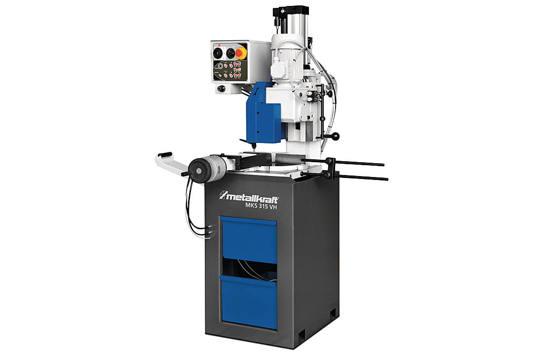- Model MKS 315 VH wyposażony jest w szybkoobrotowe imadło pneumatyczne przesuwane poprzecznie wraz z mechanizmem, który zabezpiecza przed zadziorami.