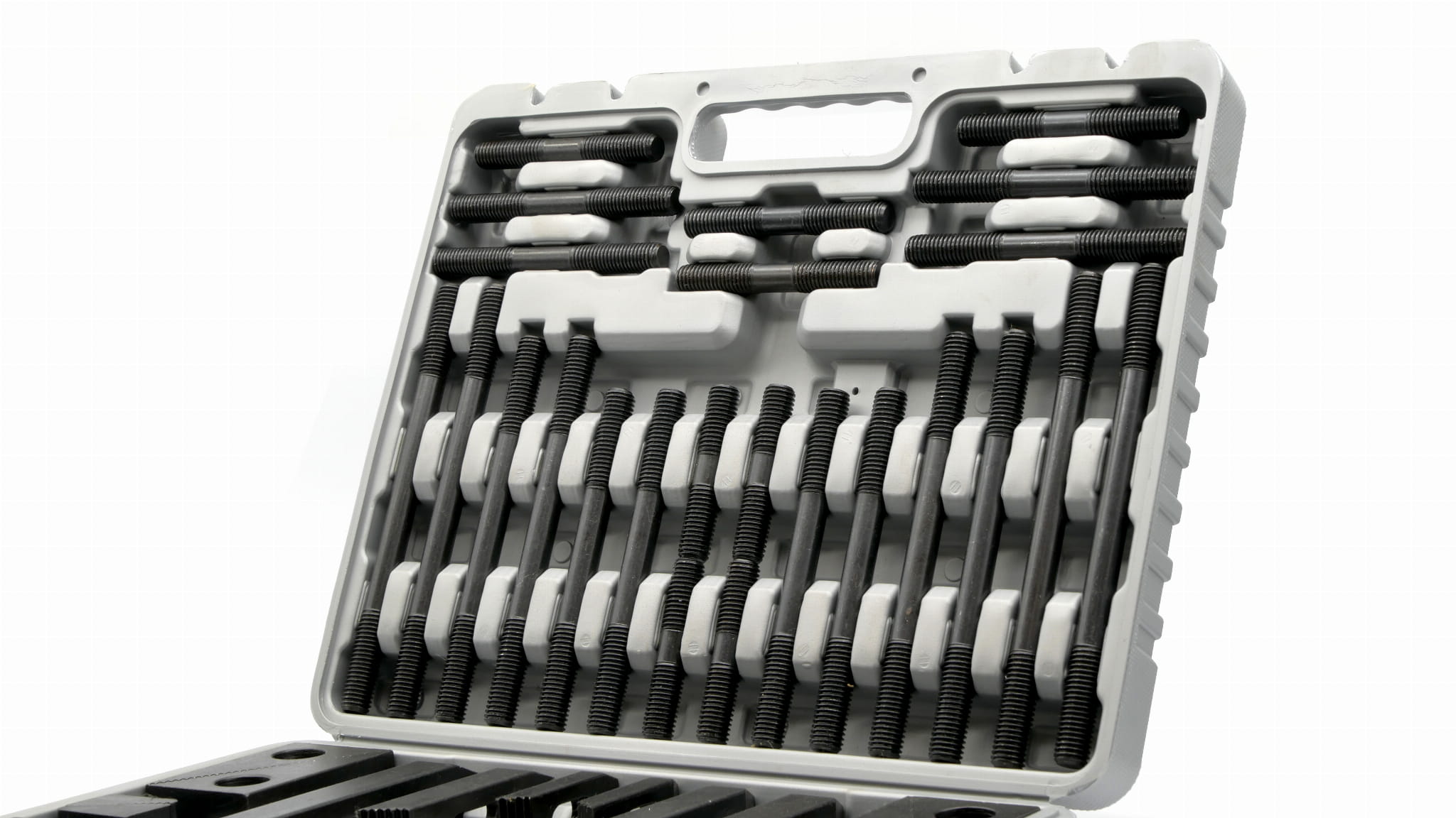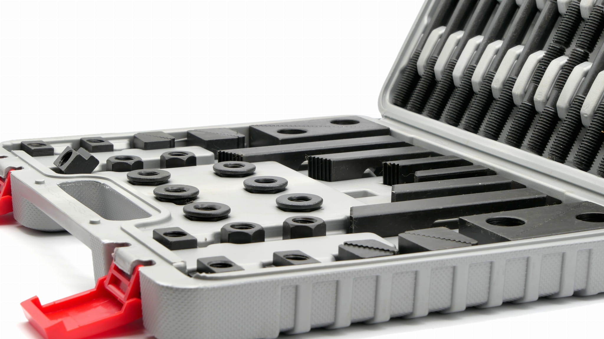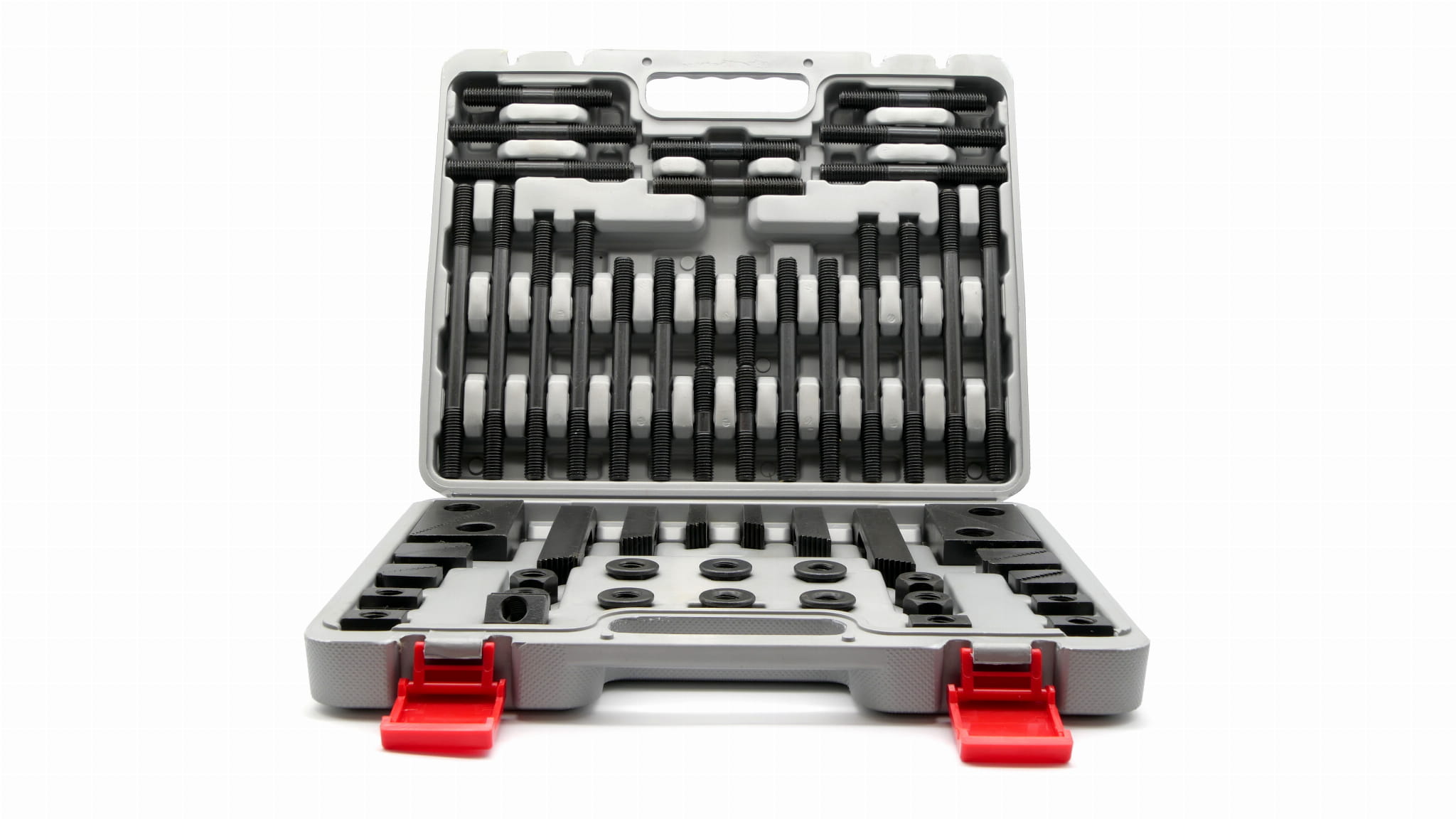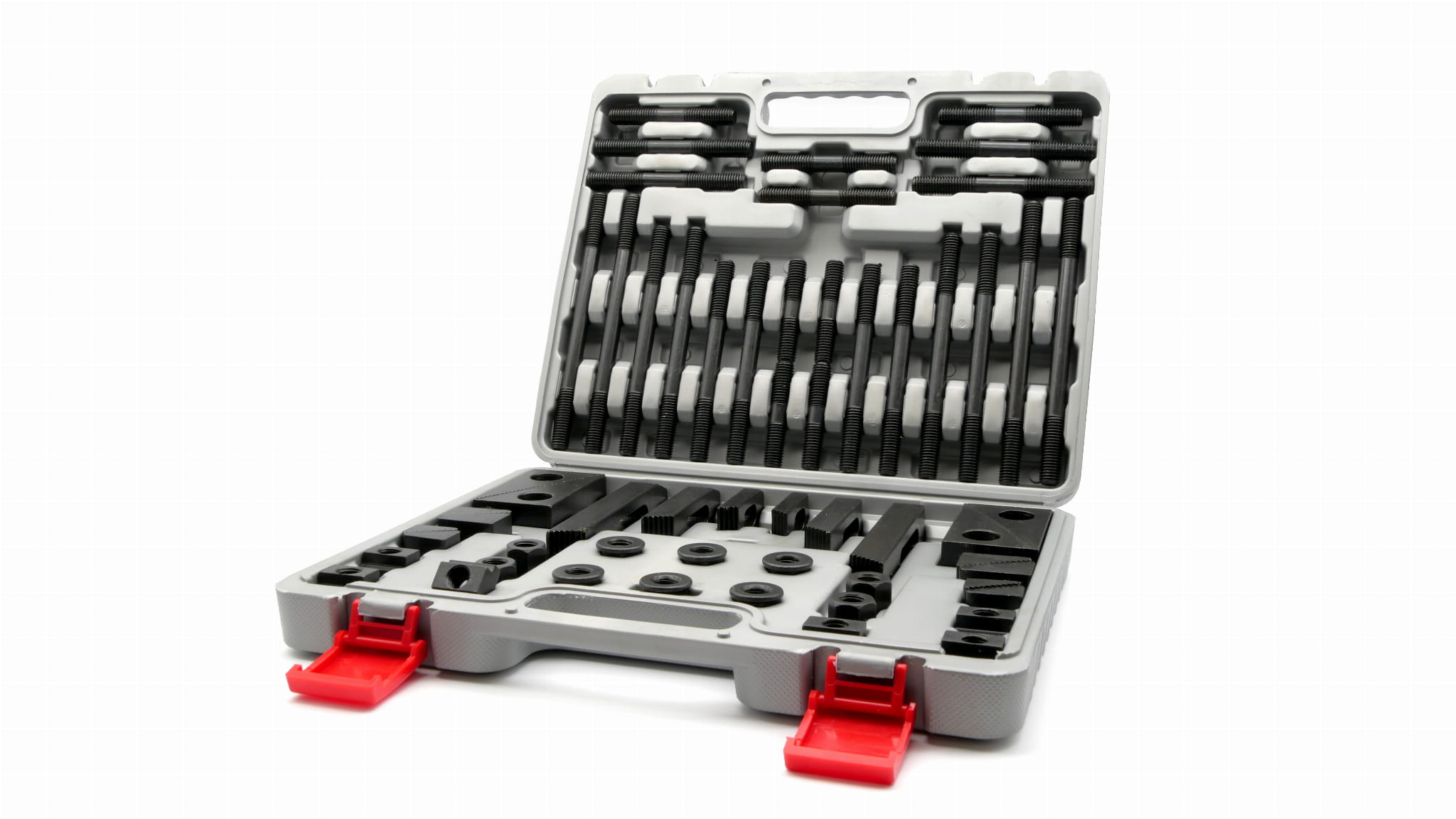 - Zestaw elementów mocujących do stosowania przy pracach frezarskich, wiertarskich itp.