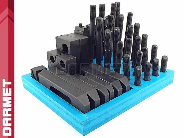 - Zestaw elementów mocujących do stosowania przy pracach frezarskich, wiertarskich itp.