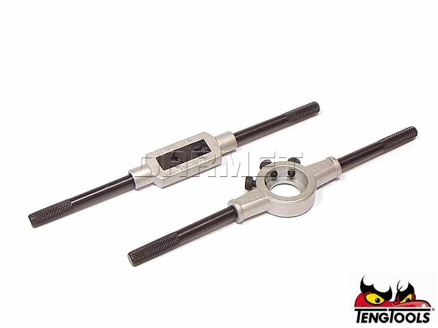 - Zestaw 17-częściowy, zawierający po jednym gwintowniku i narzynce każdego rozmiaru, oraz pokrętło do gwintowników i uchwyt do narzynek, przymiar do gwintów