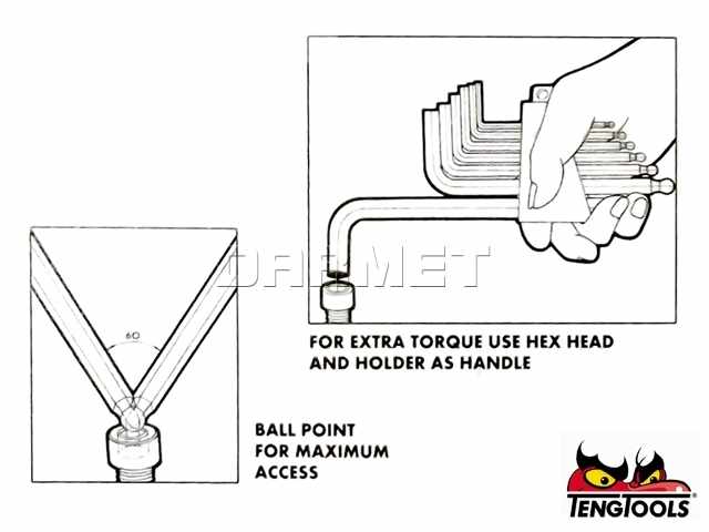 - Kuliście uformowana końcówka na dłuższym końcu klucza umożliwia pracę przy przechyle